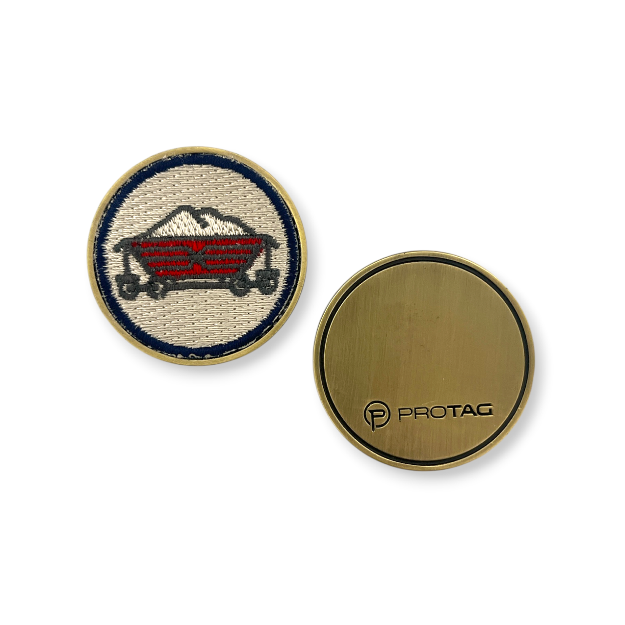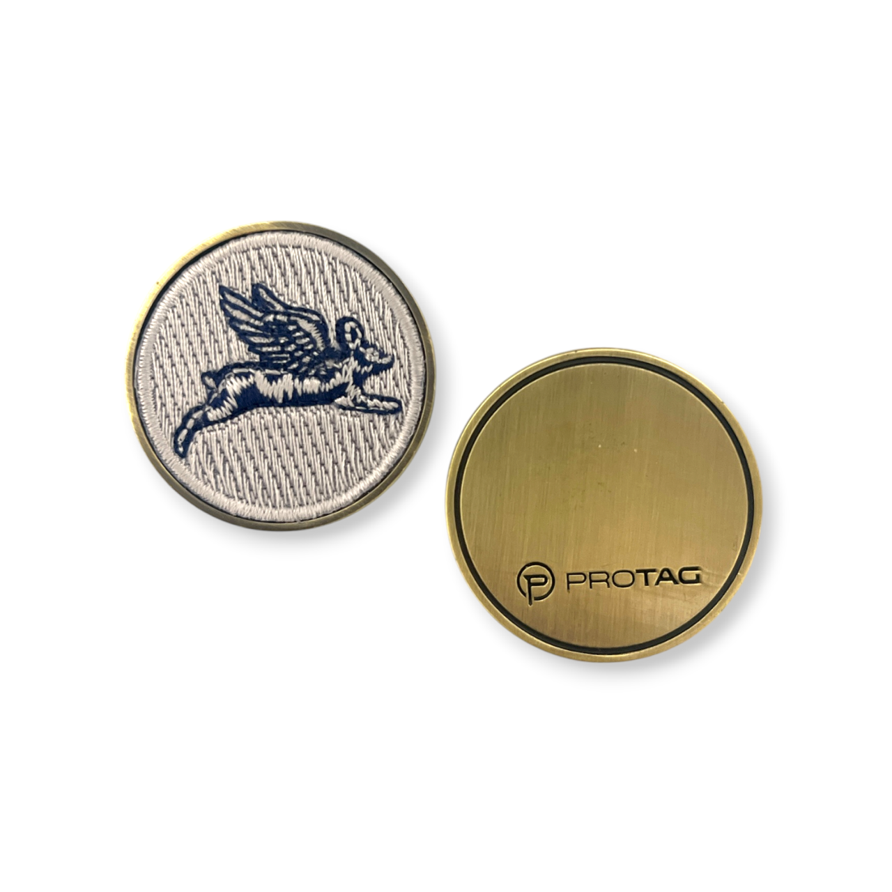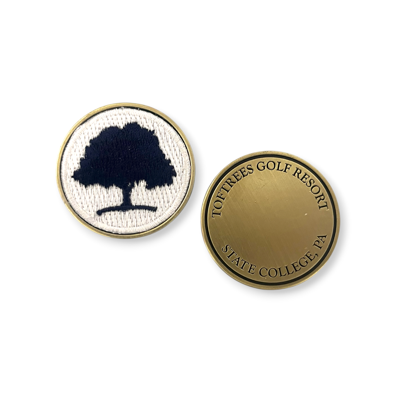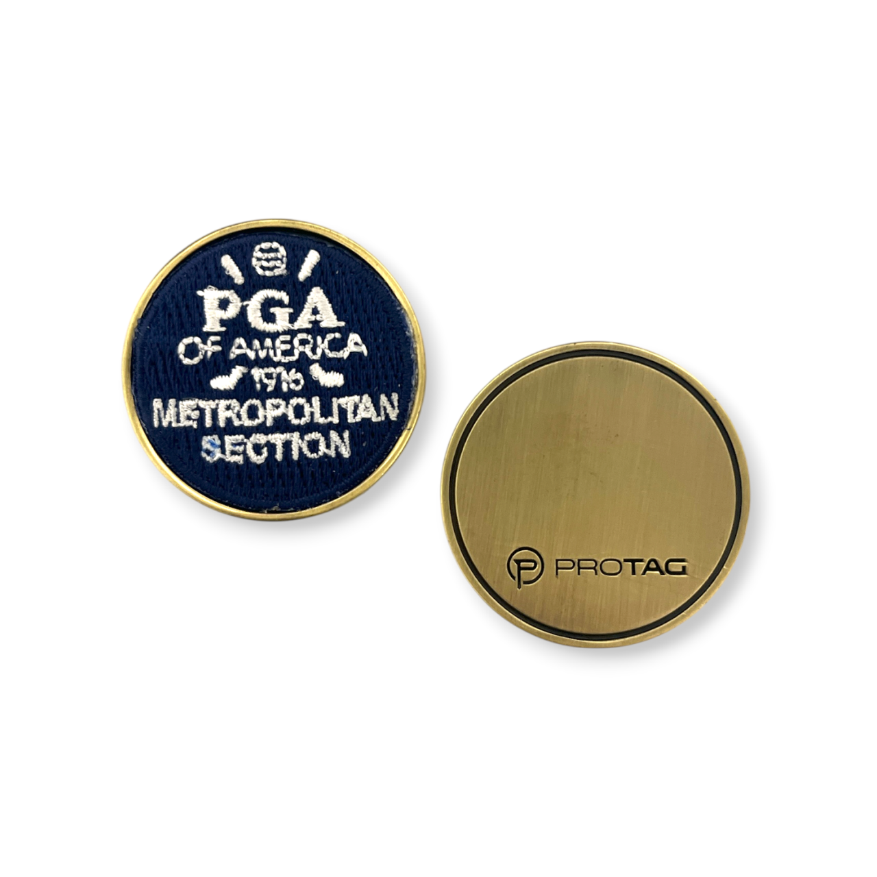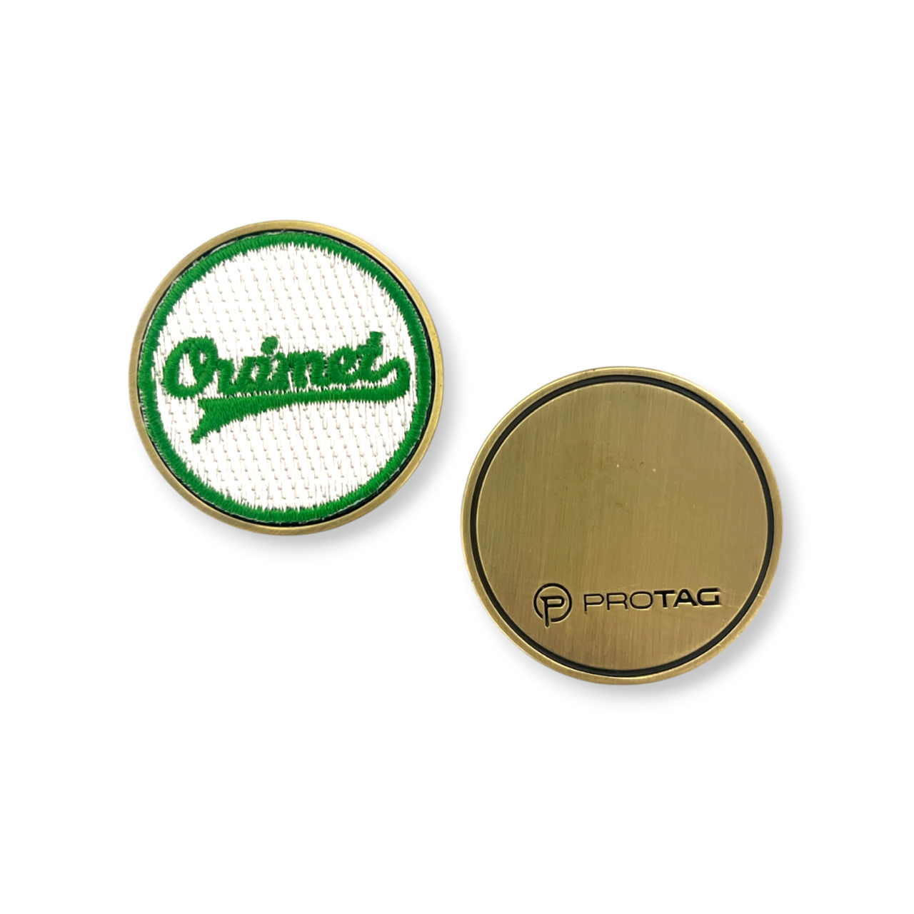 This ball marker has a diameter of 1-1/2″. Popular metal finish options would be antique silver, brass, copper or black nickel. This ball marker has an embroidered patch that is mounted into the metal base. Side 2 can be customized as well.